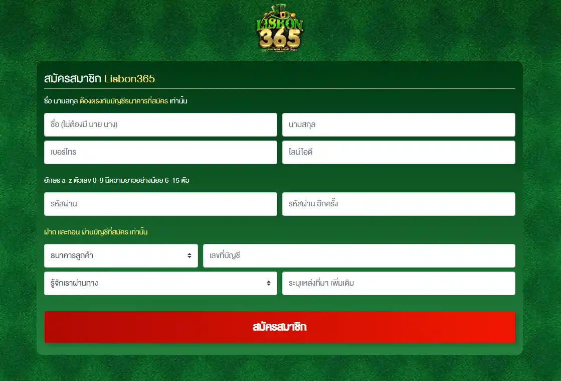ยินดีต้อนรับเข้าสู่ช่องทางการสมัครสมาชิก lisbon365 เว็บสล็อตออนไลน์มาแรงที่รวมความบันเทิงไว้ครบวงจรที่สุดในขณะนี้ สำหรับใครที่กำลังมองหาพื้นที่เดิมพันที่มั่นคง ปลอดภัย และมีมาตรฐานสากลรองรับ การเริ่มต้นที่นี่ถือเป็นทางเลือกที่คุ้มค่าที่สุด โดยเฉพาะสิทธิพิเศษสำหรับสมาชิกใหม่ที่จัดเต็มตั้งแต่วันแรก เพื่อให้การสมัครของท่านเป็นไปอย่างราบรื่นและได้รับสิทธิประโยชน์ครบถ้วน บทความนี้จะเจาะลึกทุกขั้นตอนการสมัคร พร้อมเผยเคล็ดลับการรับโบนัสให้ผ่านฉลุยในครั้งเดียวครับ